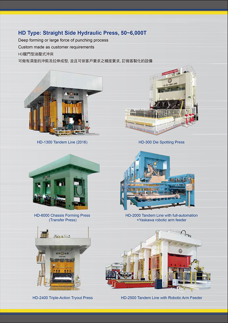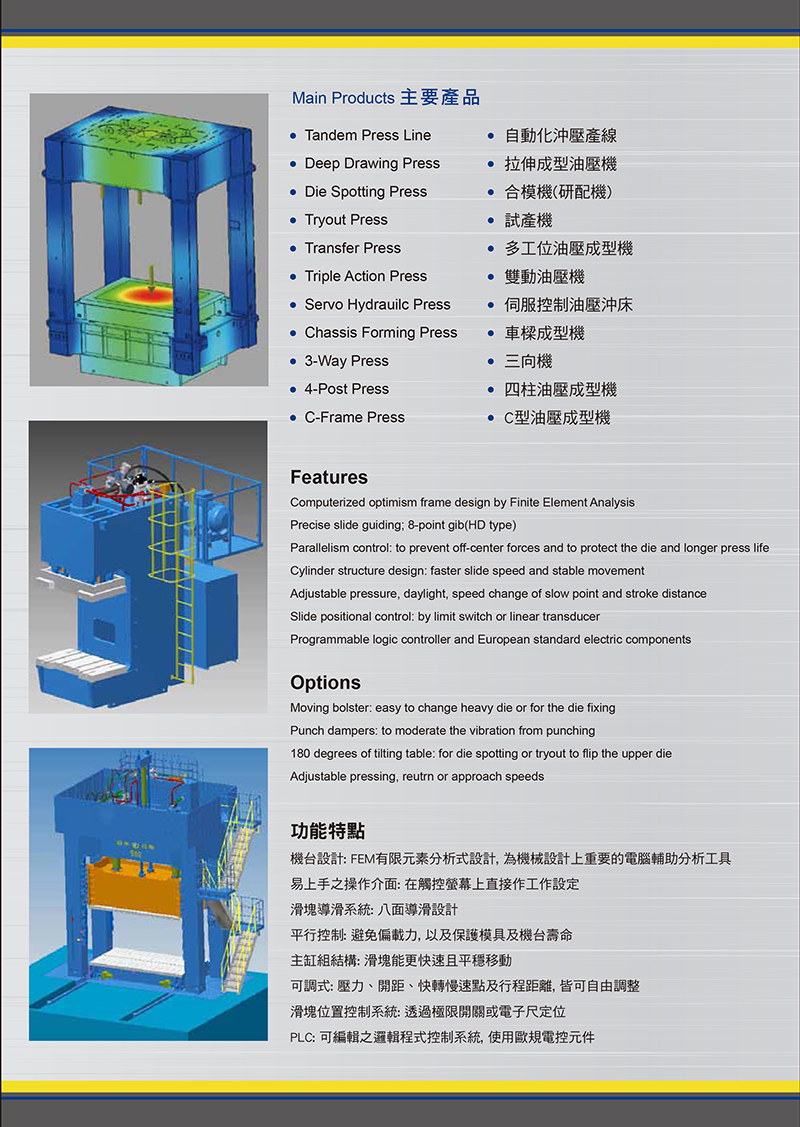 迪斯45年來秉持著,為客戶提供新穎化技術、一貫化製造及全方位整合目前總廠區達53,000平方米,擁有最新穎及最完善之油壓設生產基地,堅持一貫化製造理念,為客戶創造最優質及高附加價值的油壓機械.擁有ISO 9001:2015及CE認證,控制產品性能優越及安全的品質,至今已銷售至世界85國,迪斯可提供10到6,000噸能力之機台 油壓式機械沖床用途: 金屬料件的成型、沖剪、折邊等, 或複合材料之成型、剪切及黏合等.