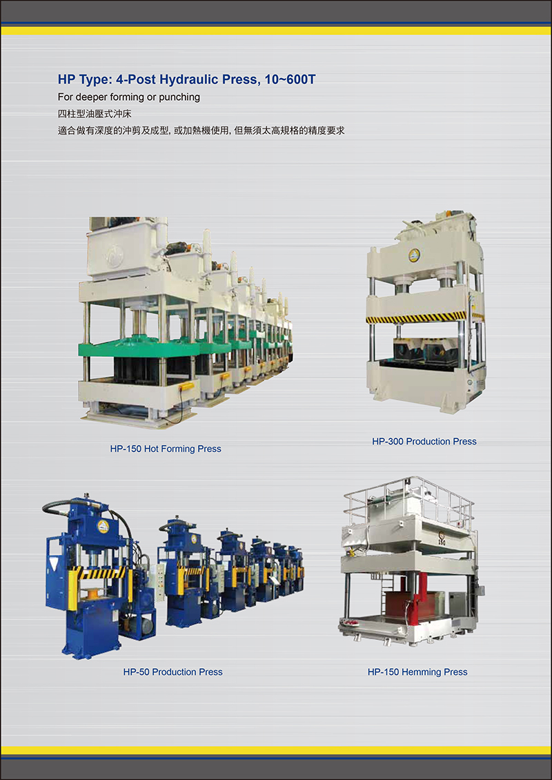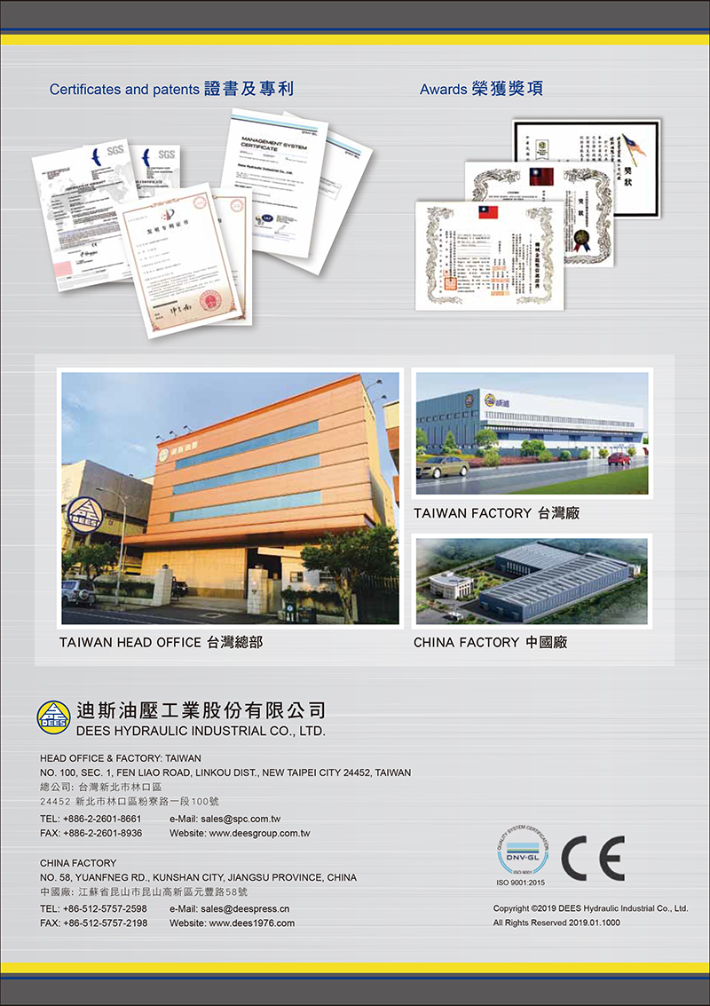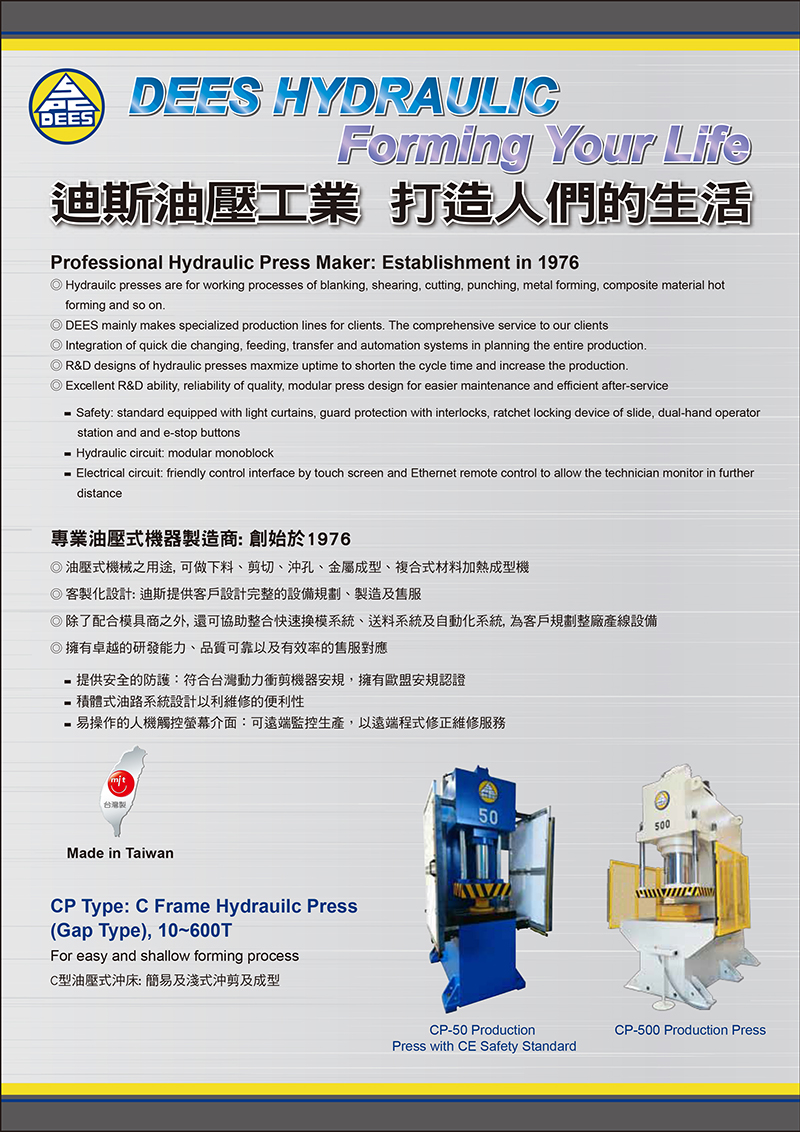 迪斯45年來秉持著,為客戶提供新穎化技術、一貫化製造及全方位整合目前總廠區達53,000平方米,擁有最新穎及最完善之油壓設生產基地,堅持一貫化製造理念,為客戶創造最優質及高附加價值的油壓機械.擁有ISO 9001:2015及CE認證,控制產品性能優越及安全的品質,至今已銷售至世界85國,迪斯可提供10到6,000噸能力之機台 油壓式機械沖床用途: 金屬料件的成型、沖剪、折邊等, 或複合材料之成型、剪切及黏合等.